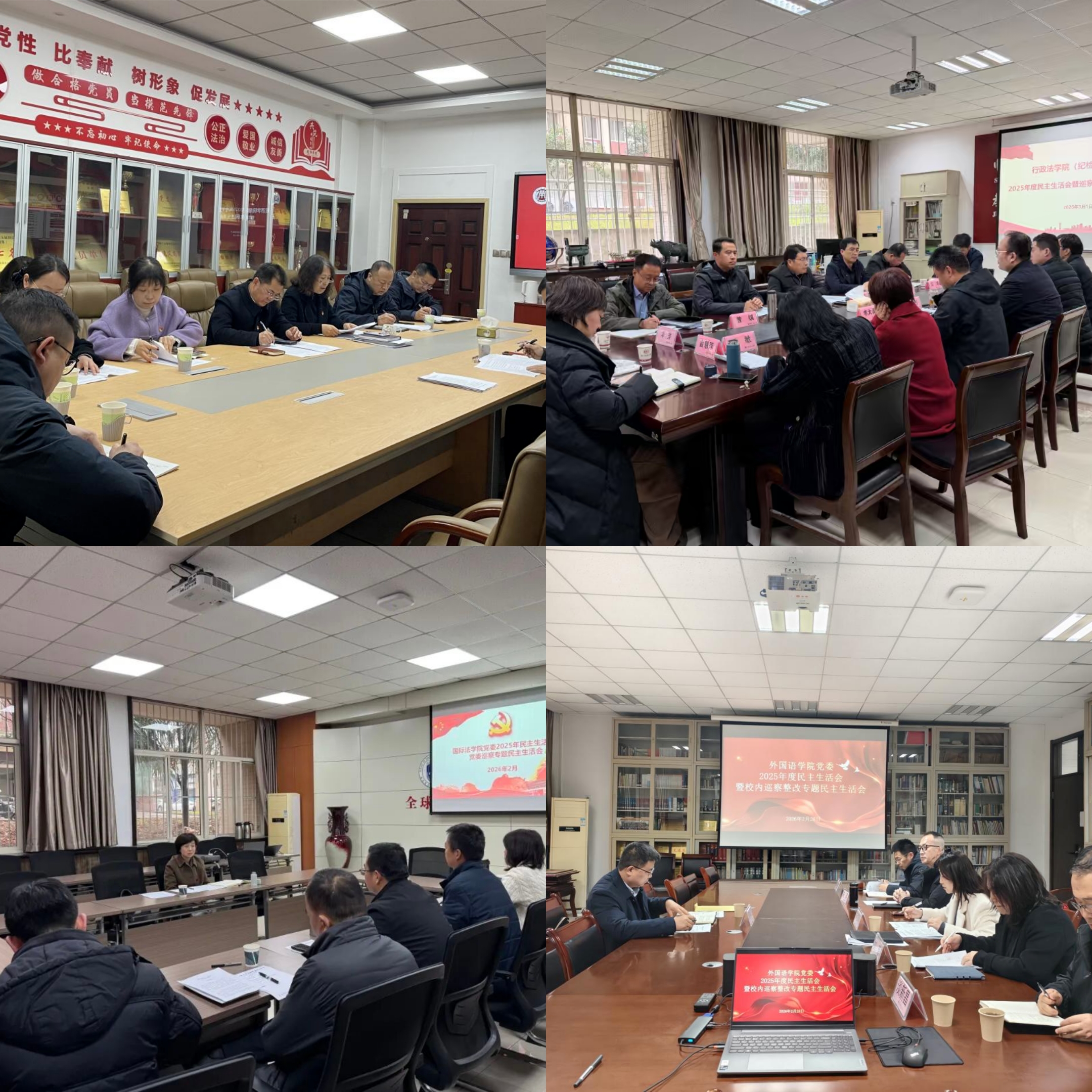 为扎实推进校内巡察整改工作走深走实,切实把巡察成果转化为推动事业发展的强大动力,近期,我校2025年第一轮被巡察单位经济学院党委、行政法学院(纪检监察学院)党委、国际法学院党委、外国语学院党委分别召开2025年度民主生活会暨巡察整改专题民主生活会。校党委副书记郭武军,校党委副书记、纪委书记、监察专员刘志彬,校党委委员、宣传部部长宋白,校党委委员、统战部部长、招生就业处处长燕福民分别到会指导,被巡察党组织领导班子成员、党委委员等参会,会议由各党组织书记主持。