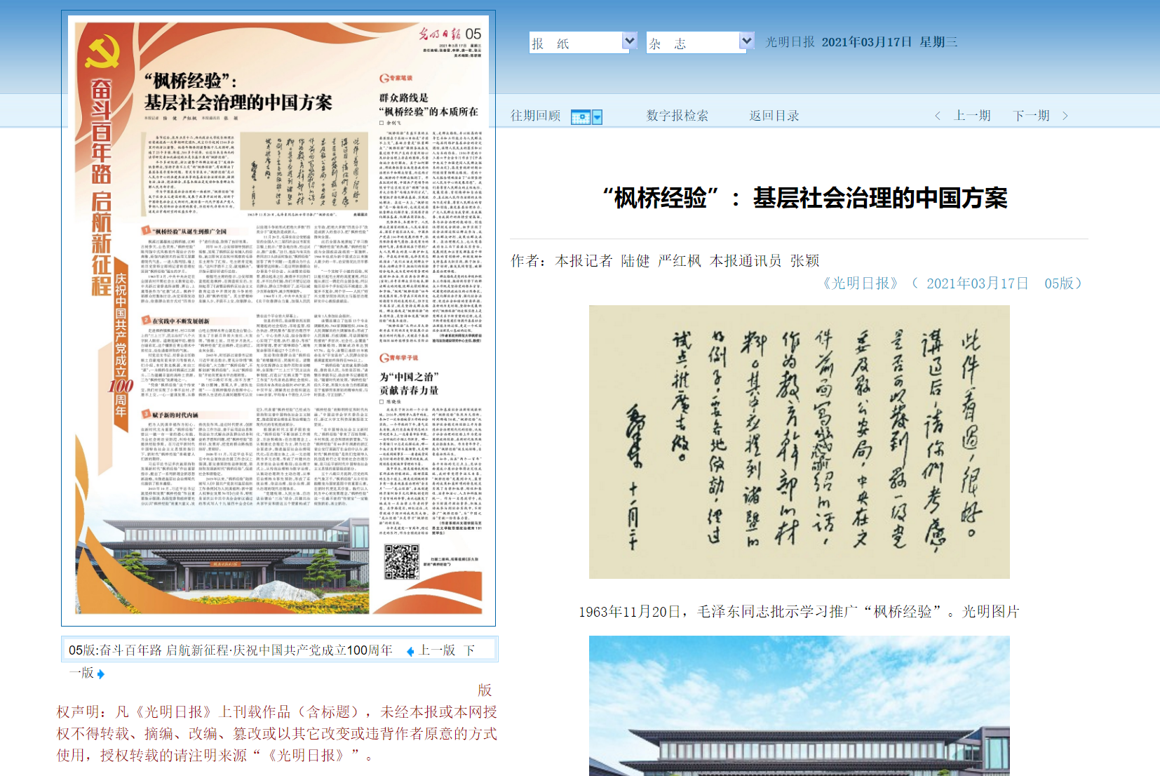 1963年11月20日,毛泽东同志批示学习推广“枫桥经验”。光明图片